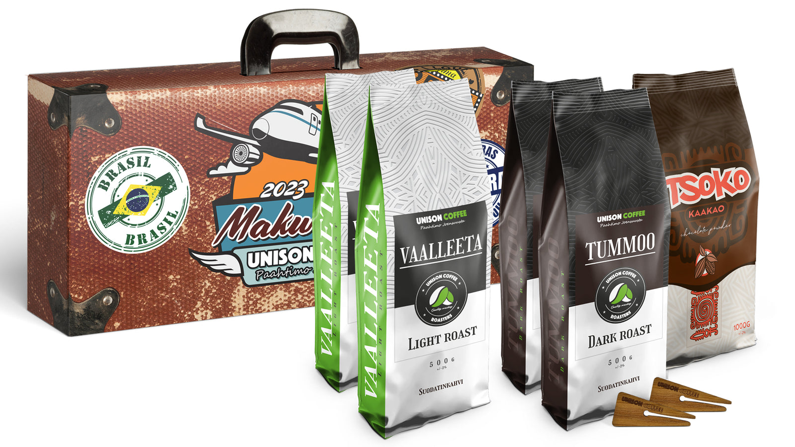 Tämä laatikko sisältää 2 vaalleeta kahvia, 2 tummoo kahvia, tsoko-kaakaon + kaks pussinsulkijaa.