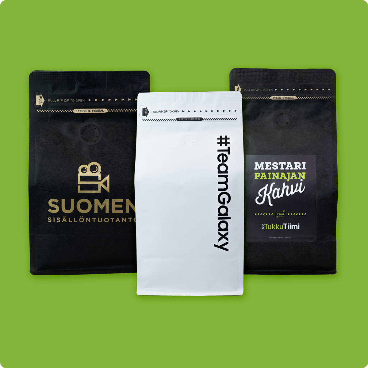 Käsin paahdettu laadukas ja erinomaisen makuinen kahvi on personoitu ja mieleenpainuva lahja asiakkaillesi. Valitse pussikoko, malli ja käytettävä tarra.