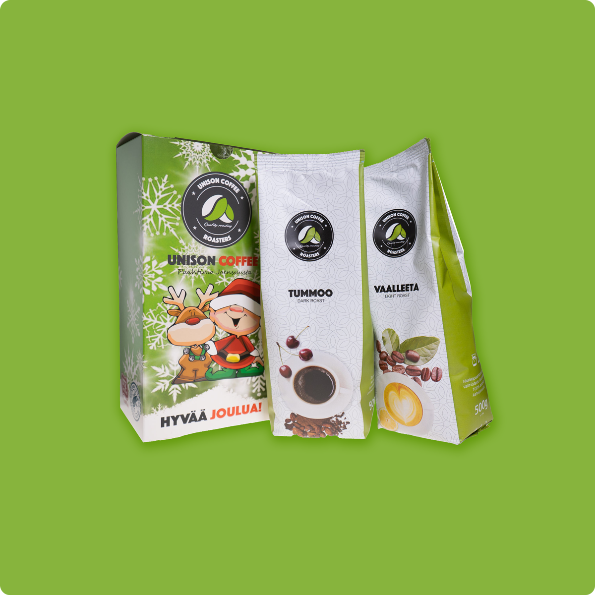 Jouluinen pakkaus sisältää paahtimomme Tummoo ja Vaalleeta kahvia jouluisessa lahjalaatikossa.